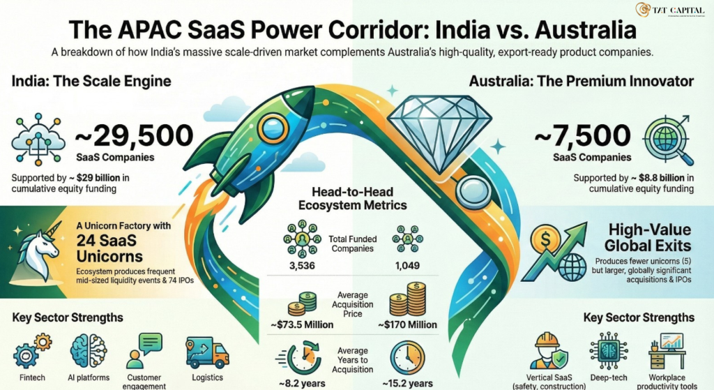 Australia and India together form one of the most important SaaS corridors in Asia–Pacific. India brings scale and depth of deal flow, while Australia produces a high concentration of global-grade, export-ready SaaS leaders.