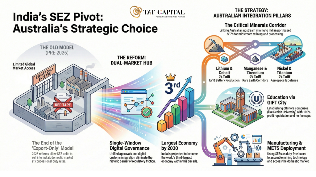 The SEZ framework—especially under Budget 2026 reforms—positions India as a complementary industrial partner rather than merely a trade destination.